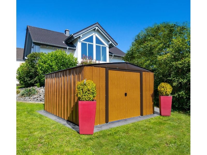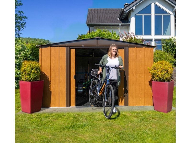 A kerti tároló a rendkívül masszív fémlemez szerkezet előnyeit ötvözi a stílusos, természetes fa megjelenéssel. A fa kerti tárolókkal ellentétben ez a fém kerti ház nem igényel rendszeres karbantartást vagy kezelést.