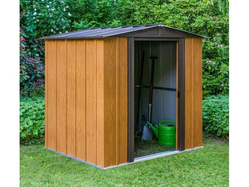 A kerti tároló a rendkívül masszív fémlemez szerkezet előnyeit ötvözi a stílusos, természetes fa megjelenéssel. A fa kerti tárolókkal ellentétben ez a fém kerti ház nem igényel rendszeres karbantartást vagy kezelést.