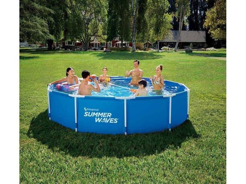 A földre állított medence váza fémből készült acélcsövekből áll. A medence külső fala klasszikus kék dizájnnal rendelkezik.