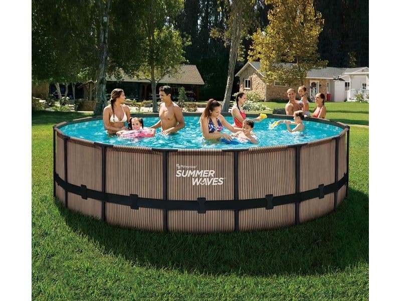 A földre állított medence váza fémből készült acélcsövekből áll. A fa hatású külső medencefal szinte bármilyen kertbe jól illeszkedik.