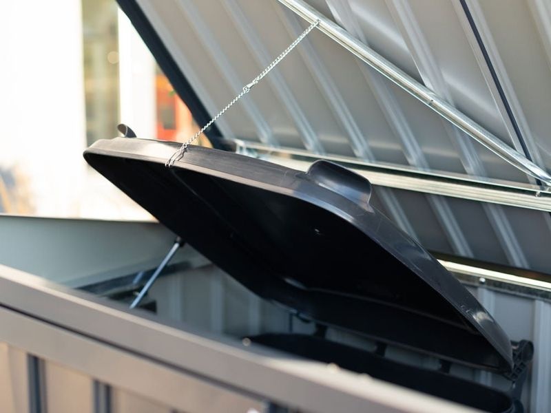 A box gázrugókkal van felszerelve a fedél biztonságos és kényelmes nyitásához. Az integrált láncok segítségével a szemetesek fedele együtt nyílik a box fedelével. Az extra széles, kétszárnyú ajtók (150 × 127 cm) megkönnyítik a hozzáférést és a kukák kihúzását.