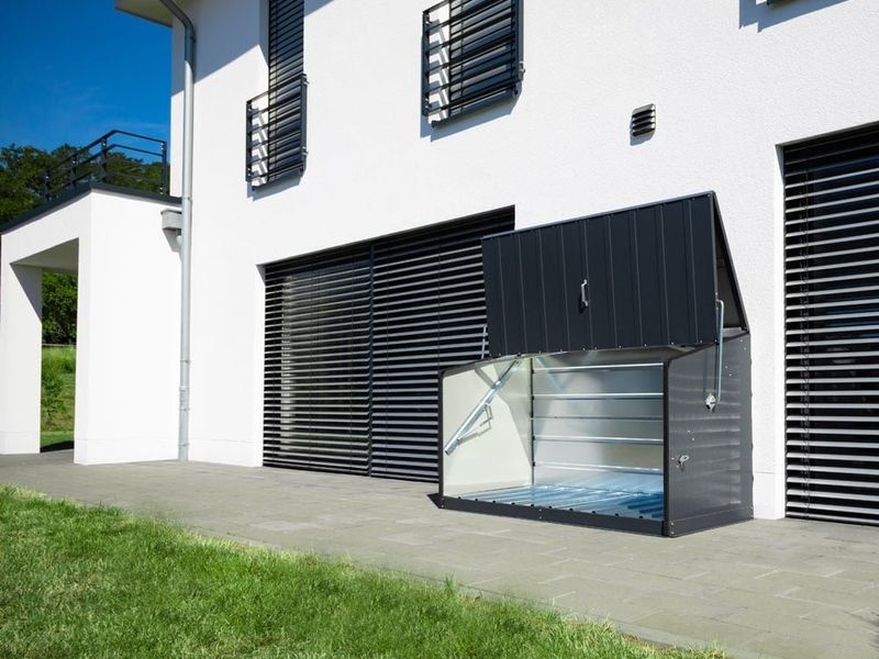 A doboz horganyzott acélból, PVC bevonattal készült, amely magas fokú ellenállást biztosít a korrózióval, az időjárási hatásokkal és a tűzzel szemben. A rozsdamentes acél kötőelemek növelik a stabilitást és biztosítják a hosszú élettartamot. A tárolódoboz gyakorlatilag karbantartásmentes, és egész évben használható.