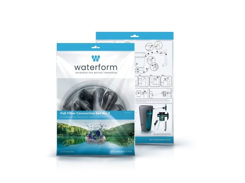 Biztosítja az esővíz be- és elvezetését a tartályba és a tartályból. A csapon tömítés és anyacsavar található, ezért a Prosperplast gyártó minden esővízgyűjtő hordójával kompatibilis (Waterform sorozat). A készlet 5 elemet tartalmaz: 3 csatlakozó, csutora, csap.