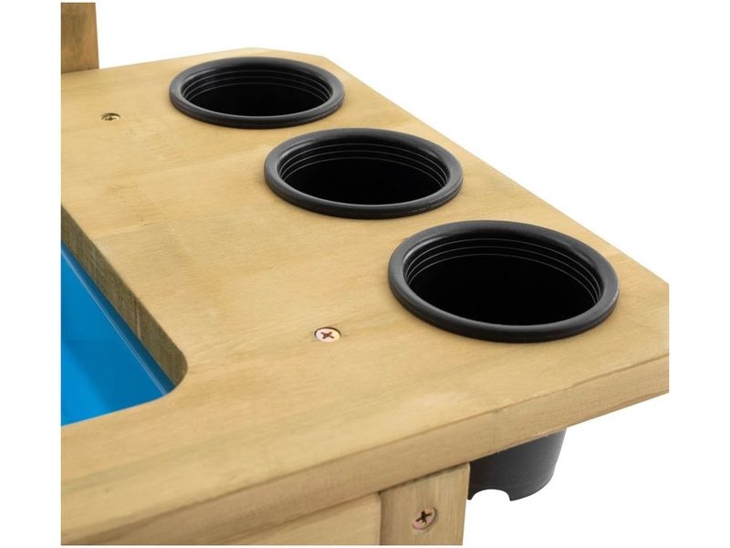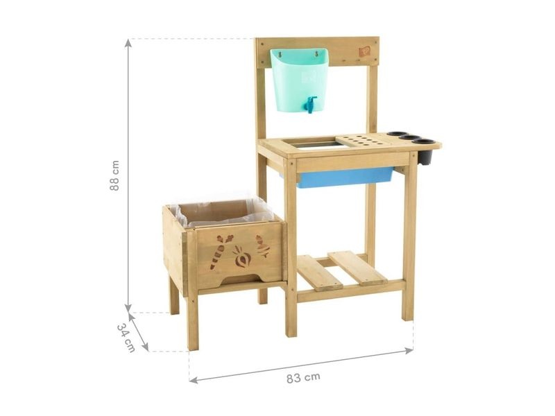 Az ültetőasztal szórakoztató funkciókkal büszkélkedhet: a mosdót néhány fogantyú segítségével eltávolítható, és föld vagy vízgyűjtőként szolgál. A mosdó felett mozgatható ültetőlap található, amelynek lyukain keresztül könnyen átszivárog a felesleges föld. A három kaspótartó ideális helyet biztosít a palántáknak, vagy kertészeti eszközök tárolására is használható. A mosdó felett egy könnyen feltölthető vízadagoló található, ami még több szórakozást nyújt. Az előkészített növények közvetlenül az integrált magaságyásba ültethetők. Érdekesség: a magaságyás elülső fala eltolható, így a gyerek láthatja a palánták növekedését – ez az látható siker még izgalmasabbá teszi a kertészkedést!