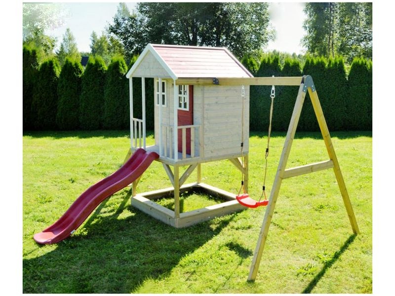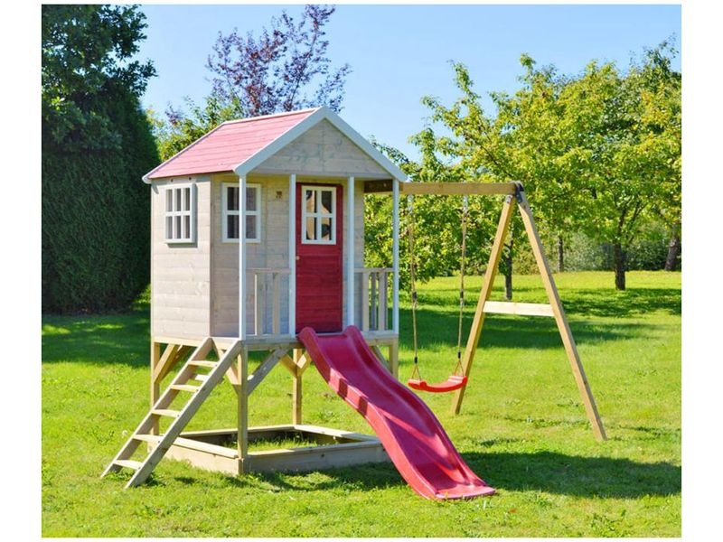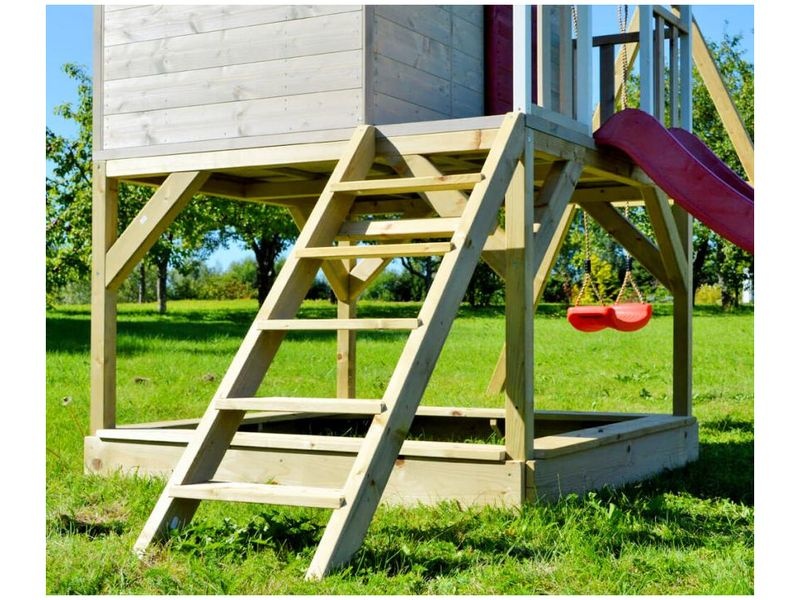 A házikó csúszdával (amelyhez létra vezet) és fedett homokozóval van