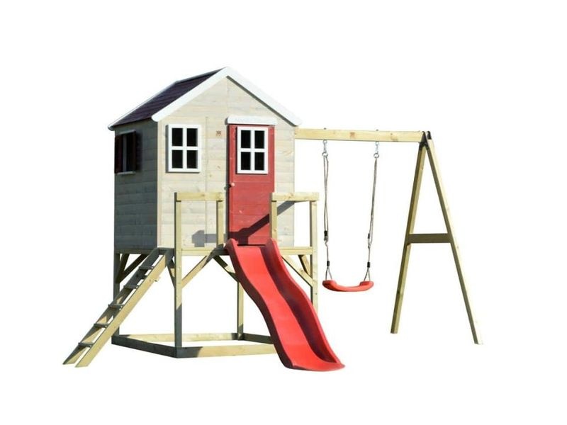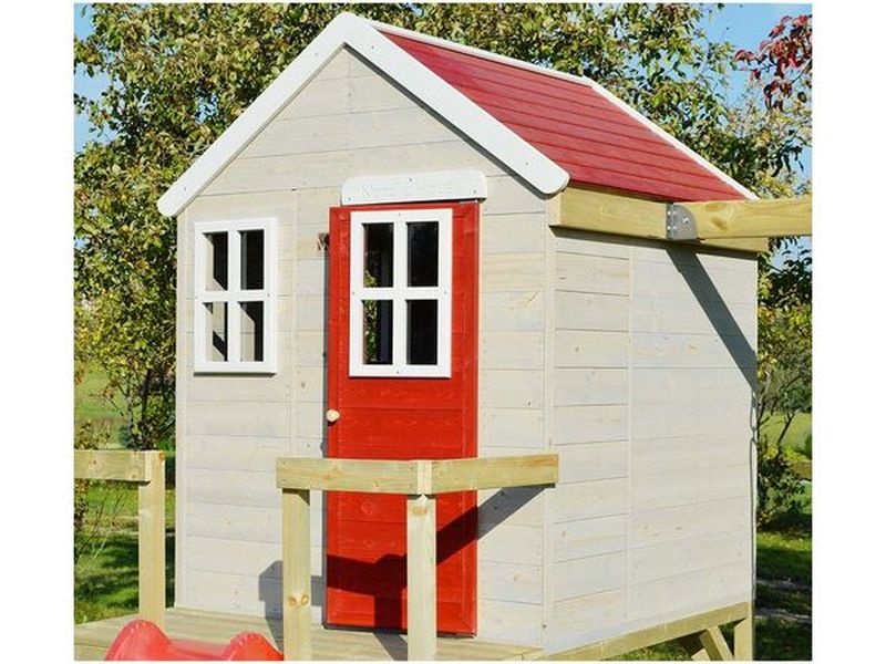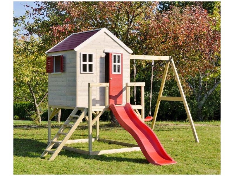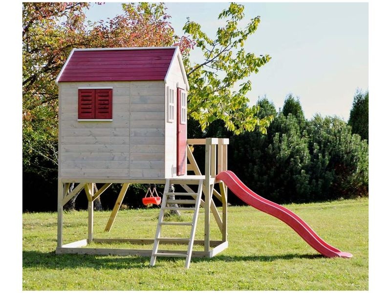 A házikó csúszdával (amelyhez létra vezet) és fedett homokozóval van
