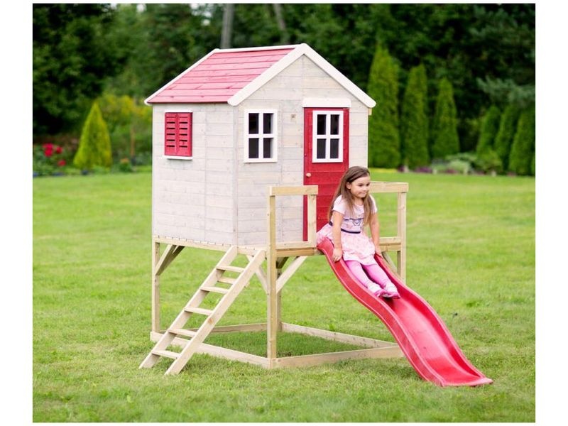 A házikó csúszdával (amelyhez létra vezet) és fedett homokozóval van