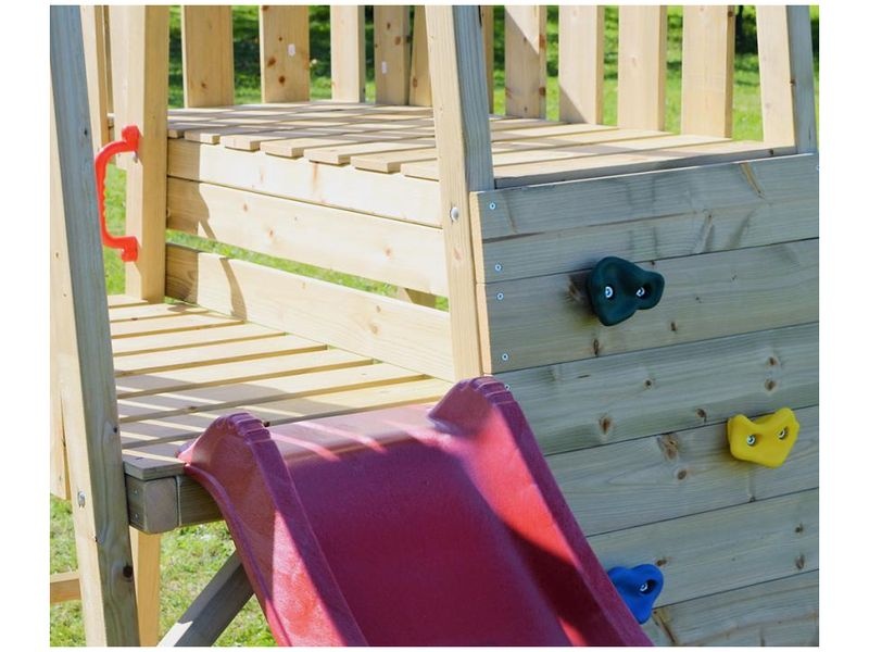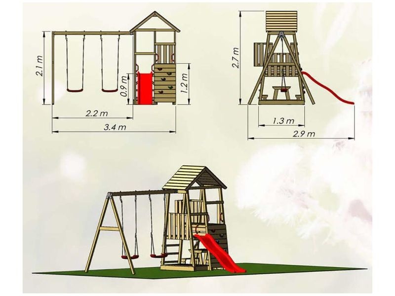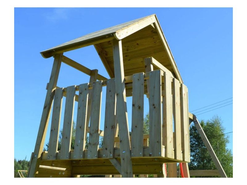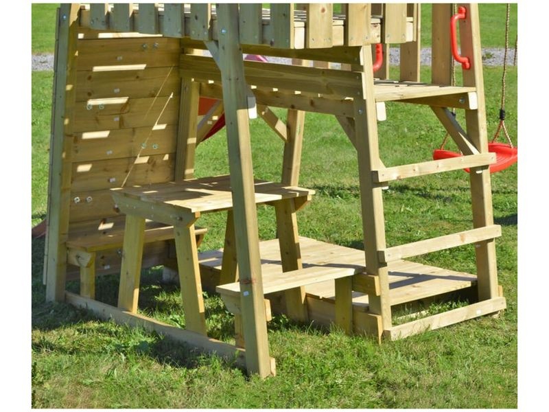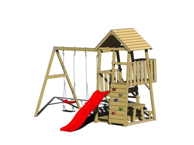 A 280×340×270 cm méretű játszótorny praktikus és szórakoztató kiegészítője kertjének. A torony része egy csúszda két hintával, mászófallal és piknikasztallal, ami remek játéklehetőségeket biztosít a gyerekeknek. Ideális hely a kalandokhoz és kreatív játékokhoz, amelyek örömet és szórakozást nyújtanak gyermekeinek.