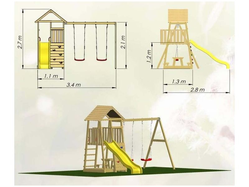A 280×340×270 cm méretű játszótorony praktikus és szórakoztató kiegészítője kertjének. A torony része egy csúszda két hintával és mászófallal, amelyek remek játéklehetőségeket biztosítanak a gyerekeknek. Ideális hely a kalandokhoz és kreatív játékokhoz, amelyek örömet és szórakozást nyújtanak gyermekeinek.