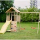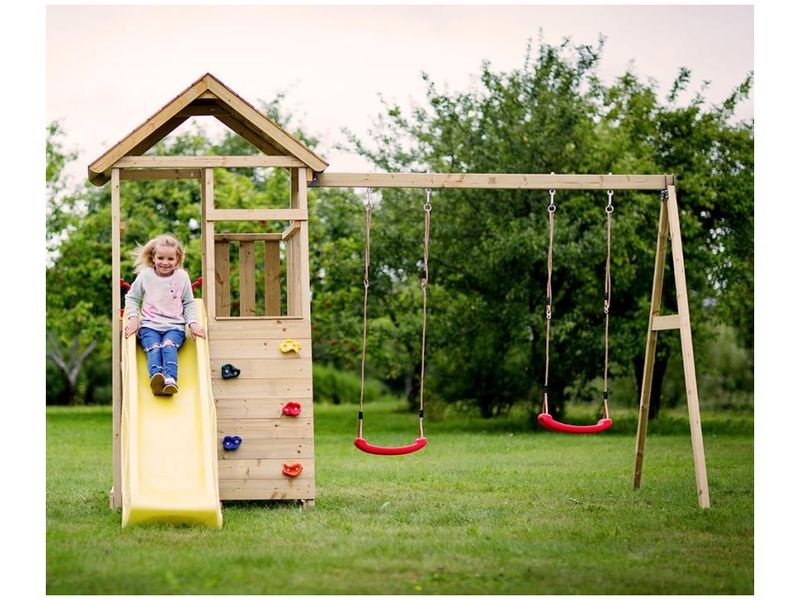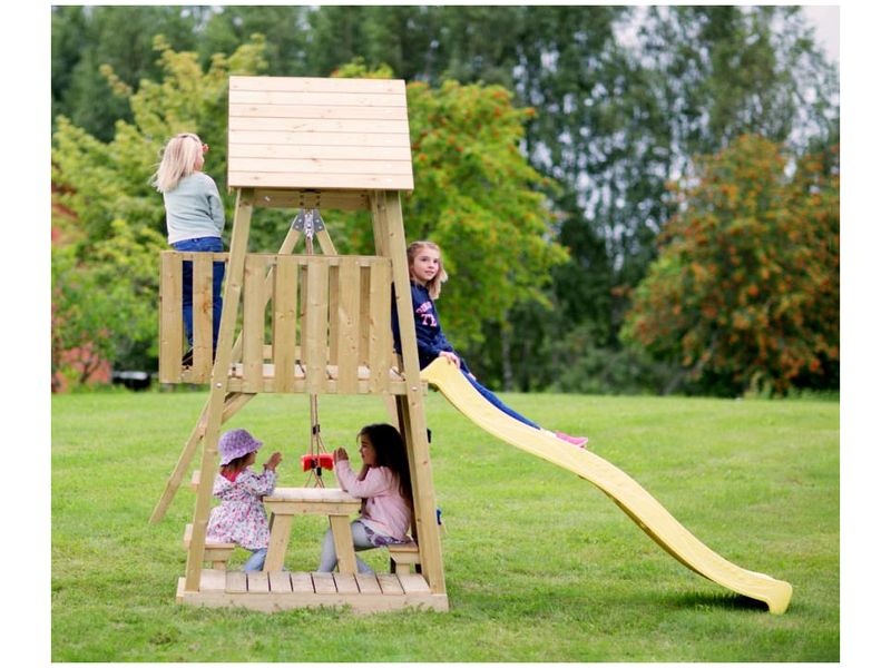 A játszótorony csúszdával van felszerelve, amelyhez létra és mászófal vezet. Gyermeke titkos búvóhelyet alakíthat ki a házikóban, vagy különféle kreatív játékokban vehet részt. Többek között a gyerekek rengeteg szórakozást élvezhetnek a hintán.