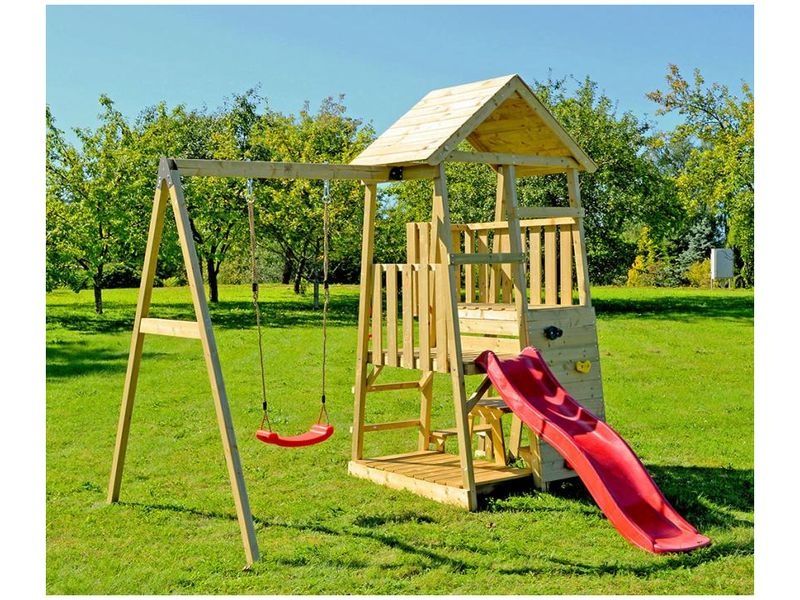 A 290×270×270 cm méretű játszótorny praktikus és szórakoztató kiegészítője kertjének. A torony része egy csúszda hintával, mászófallal és piknikasztallal, ami remek játéklehetőségeket biztosít a gyerekeknek. Ideális hely a kalandokhoz és kreatív játékokhoz, amelyek örömet és szórakozást nyújtanak gyermekeinek.
