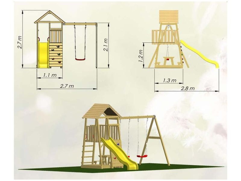 A 280×270×270 cm méretű játszótorny praktikus és szórakoztató kiegészítője kertjének. A torony része egy csúszda hintával, mászófallal és piknikasztallal, amelyek remek játéklehetőségeket biztosítanak a gyerekeknek. Ideális hely a kalandokhoz és kreatív játékokhoz, amelyek örömet és szórakozást nyújtanak gyermekeinek.