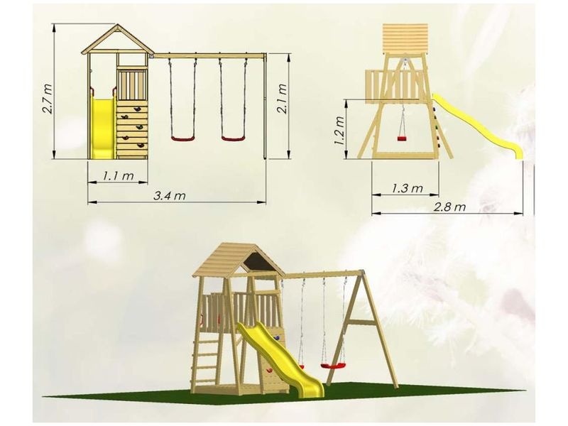 A 280×340×270 cm méretű játszótorny praktikus és szórakoztató kiegészítője kertjének. A torony része egy csúszda két hintával, mászófallal és homokozóval, amelyek remek játéklehetőségeket biztosítanak a gyerekeknek. Ideális hely a kalandokhoz és kreatív játékokhoz, amelyek örömet és szórakozást nyújtanak gyermekeinek.