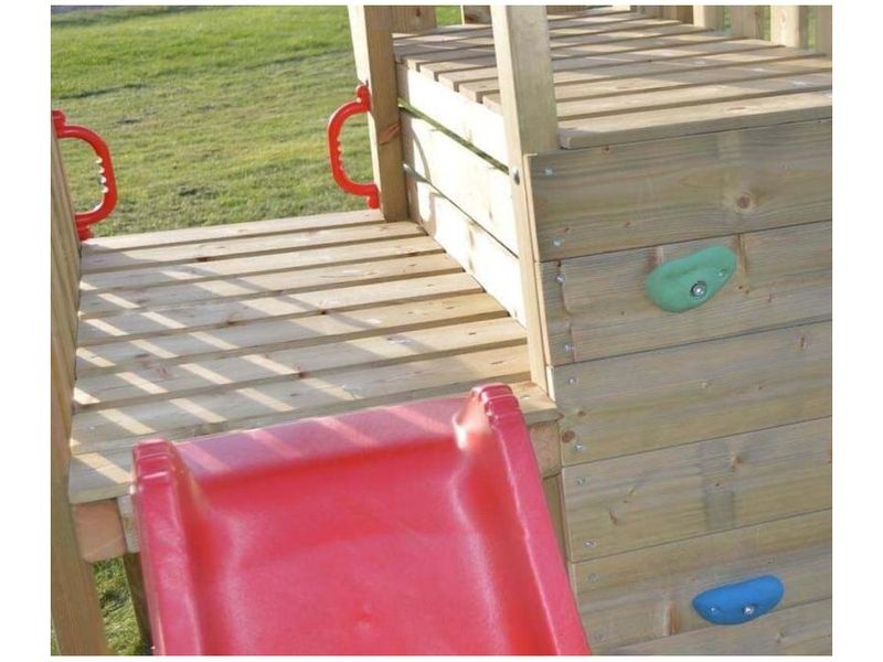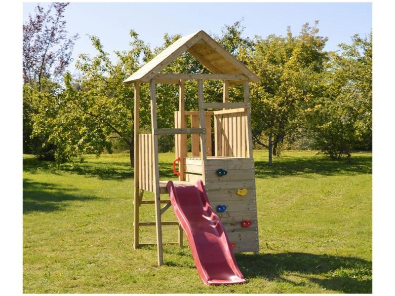 A 280×340×270 cm méretű játszótorny praktikus és szórakoztató kiegészítője kertjének. A torony része egy csúszda mászófallal és beépített emelvénnyel, ami nagyszerű játéklehetőségeket kínál a gyerekek számára. Ideális hely a kalandokhoz és kreatív játékokhoz, amelyek örömet és szórakozást nyújtanak gyermekeinek.