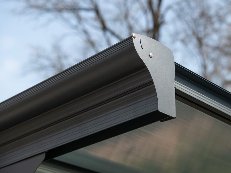 A tető 6 mm vastag cellás polikarbonát lemezekből áll, amelyek elegendő fényt engednek át, miközben védelmet nyújtanak az UV-sugárzás ellen. A lemezek akár 100 kg/m² hóterhelést is elbírnak. A csomag része az integrált ereszcsatorna rendszer is, amely biztosítja a csapadékvíz hatékony elvezetését.