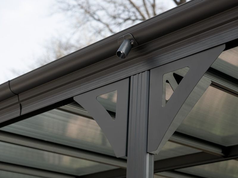 A tető 6 mm vastag cellás polikarbonát lemezekből áll, amelyek elegendő fényt engednek át, miközben védelmet nyújtanak az UV-sugárzás ellen. A lemezek akár 100 kg/m² hóterhelést is elbírnak. A csomag része az integrált ereszcsatorna rendszer is, amely biztosítja a csapadékvíz hatékony elvezetését.